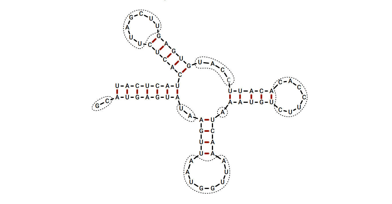 与えられた RNA 配列に対する最良の二次構造を予測したいとします。二次構造のモデルとして、次の大胆に単純化したモデルを使います: