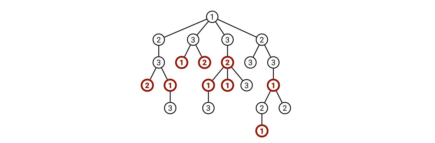 図 3.9コストが \(9\) の割り当て。赤い頂点が親よりも小さい値を割り当てられた頂点を表す。これはこの木に対する最適な割り当てではない。きちんと問題を定義すると、会社の上下関係を表す根付き木 \(T\) が与えられたときに、各頂点に \(1, 2, 3\) のどれかを割り当てます。割り当てのコストを親よりも小さな値が割り当てられる頂点の数としたときに、コストが最小となる \(T\) への割り当てを求めるアルゴリズムを説明、解析してください。