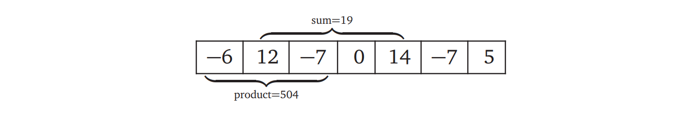 例えば入力として配列 \([-6, 12, -7, 9, 14, -7, 5]\) が与えられたとき、一つ目の問題に対するアルゴリズムは 19 を返し、二つ目の問題に対するアルゴリズムは 504 を返します。