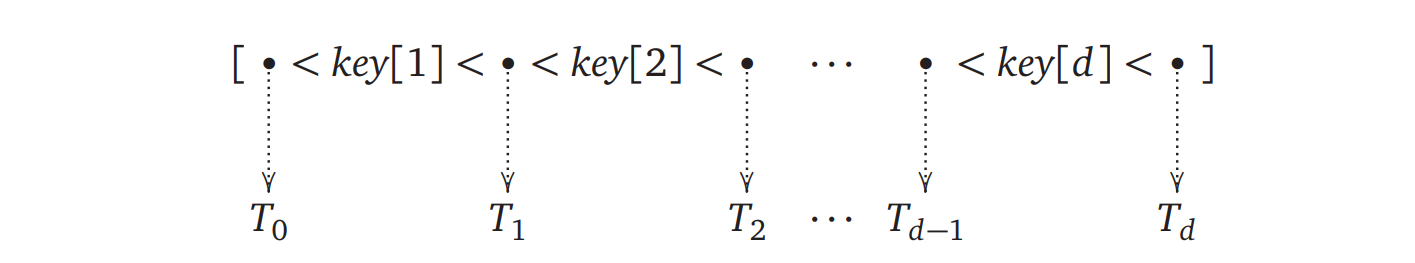 ポインタ \(\mathit{v.child}[i]\) は \(\textsc{Null}\) または他の B-木の根へのポインタです。 \(\mathit{v.child}[i]\) が木の根を指す場合、その木は \(\mathit{v.key}[i]\) より大きく \(\mathit{v.key}[i+1]\) よりも小さい鍵を保持します。また左端の部分木 \(\mathit{v.child}[0]\) は \(\mathit{v.key}[1]\) よりも小さい鍵を、右端の部分木 \(\mathit{v.child}[v.d]\) は \(\mathit{v.key}[v.d]\) よりも大きい鍵をそれぞれ保持します。