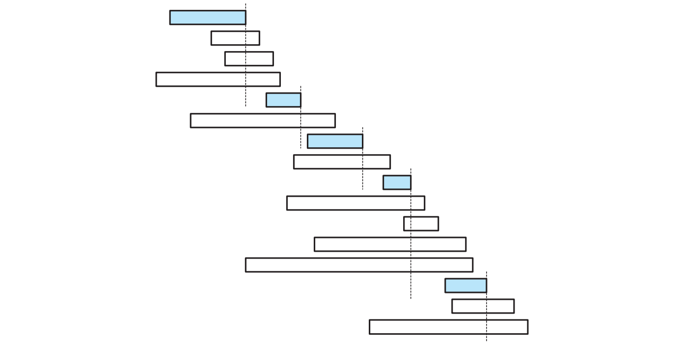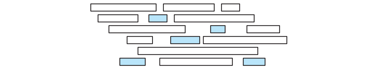 この問題を図示すると以下のようになります。講義が長方形によって表され、\(x\) 軸座標の左端と右端がそれぞれ講義の開始時刻と終了時刻を表します。垂直方向に重ならない長方形の部分集合で一番大きいものを見つけることが目標となります。