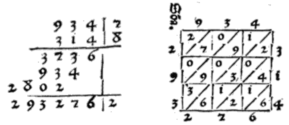これら二つのアルゴリズムは両方とも (いくつかの別種と共に) 1458 年の作者不詳の教本 L'Arte dell'Abbaco で説明され、並んで図も載っています。この本は Treviso Arithmetic としても知られており、西洋で最初の印刷された数学書です。