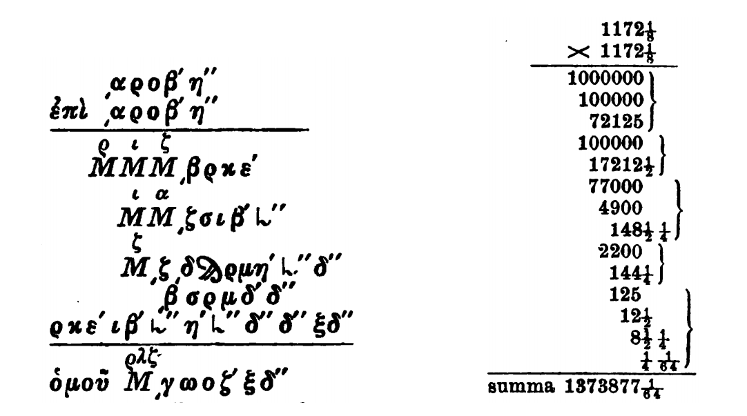 Fibonacci のアルゴリズムを人間が実行するときには、部分積を (「タブロー」とか「格子」とか呼ばれる) 二次元の表に記録し、対角線に沿って繰り上りを考えながら足して最終的な答えを計算するという方法がよく使われます。この様子を図 0.1の右側に示します。この図の左側に示すのは、一方の数 (掛けられる数) をもう一方の数 (掛ける数) の各桁で掛け、その結果を縦に並べて書いてからまとめて足すという方法です。これは現代のアメリカの小学校で教えられている方法であり、Eutocius によっても説明されています。ただし図 0.2に示すように、Eutocius の時代には数を左から右に書きました。