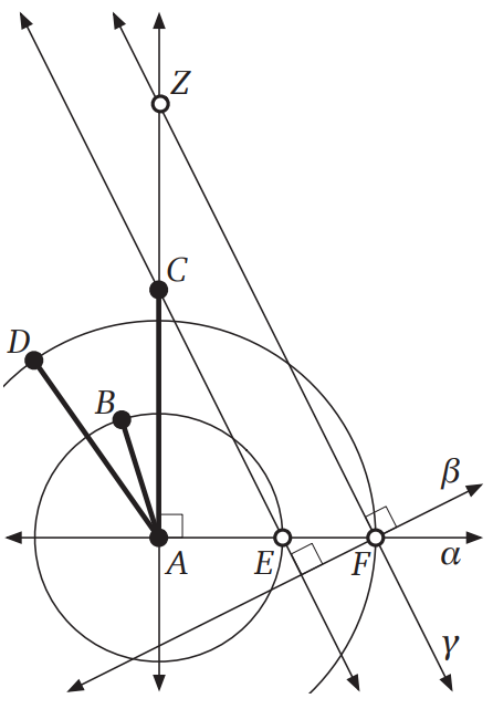 Euclid が \(\textsc{RightAngle}\) という新しい基本処理をサブルーチン (と現代のプログラマーが呼ぶであろうもの) として最初に定義している点に注目してください。このアルゴリズムの正しさは三角形 \(ACE\) と \(AZF\) が相似なことから従います。なおアルゴリズムのメイン処理の 2, 3 行目は円と直線の交点を求めているにもかかわらず二つの交点のどちらを選択するのかを示しておらず曖昧ですが、交点 \(E\) と \(F\) としてどちらを選んでもこのアルゴリズムは正しく動きます。