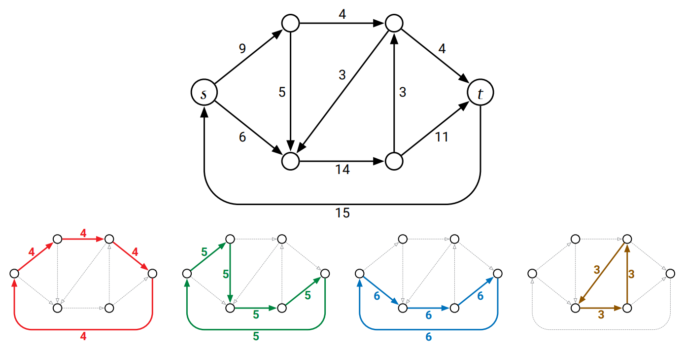 - 任意の非巡回 \((s,t)\)-フローは \((s,t)\)-路の重み付き和に分解できる。閉路は必要ない。