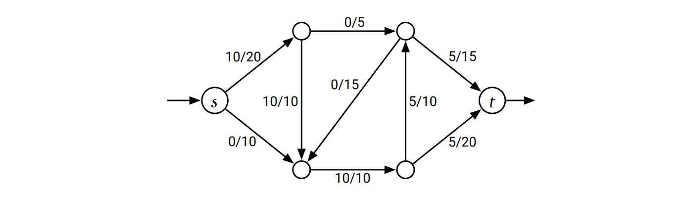 \(\pmb{(s, t)}\)-フロー (ソースとシンクが明らかな場合には単にフロー) とは、関数 \(f:E \rightarrow \mathbb{R}\) であって \(s,t\) 以外の全ての頂点 \(v\) において次の保存条件 (conservation constraint) が満たされるものを言います: \[ \sum_{u} f(u \rightarrow v) = \sum_{w} f(v \rightarrow w) \]
