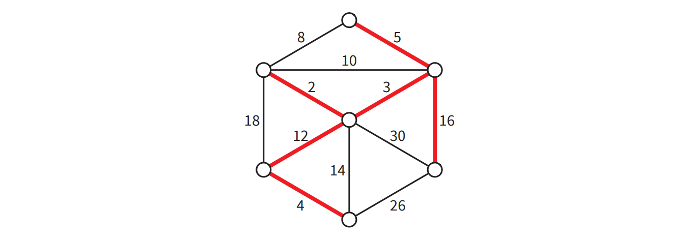 辺に重みの付いた連結無向グラフが与えられたとします。つまり、グラフ \(G=(V,E)\) と辺 \(e\) に実数の重み \(w(e)\) を割り当てる重み関数 \(w: E \to \mathbb{R}\) が与えられます (重みは正でもゼロでも負でもあり得ます)。この章で説明するのは、\(G\) の最小全域木 (minimum spanning tree, MST) を見つけるアルゴリズムです。最小全域木とは全域木 \(T\) であって次の関数を最小にするものです: \[ w(T) := \sum_{e \in T} w(e) \]