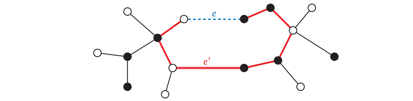 部分グラフ \(T^{\prime} \cup \lbrace e \rbrace\) にはちょうど一つの閉路 \(C\) が含まれ、\(C\) は \(e\) を通る。\(e^{\prime\prime}\) を \(C\) に含まれて \(T\) に含まれない辺とする。\(T\) は木だから、そのような辺は必ず存在する (\(e^{\prime\prime} = e^{\prime}\) かもしれないし、そうでないかもしれない)。\(e \in T\) と \(e^{\prime\prime} \notin T\)より \(e^{\prime\prime} \neq e\) であり、よって \(e^{\prime\prime} \in T^{\prime} \backslash T\) である。したがって \(w(e^{\prime\prime}) \geq w(e^{\prime}) \geq w(e)\) が分かる。