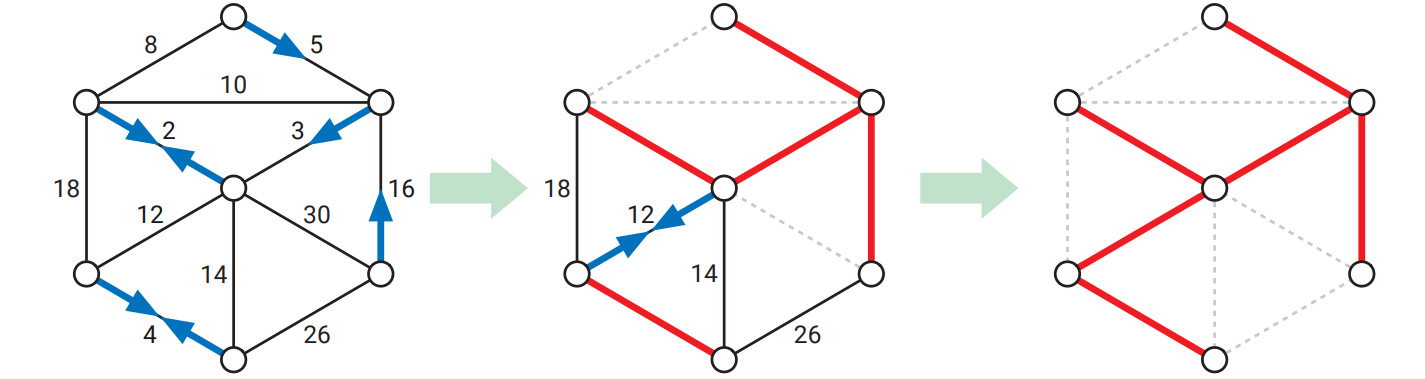 命題 7.1 より、この選び方を使えば任意のグラフの最小木が唯一となります。よって、これからこの章では辺の重さが異なるグラフが常に与えられ、その最小全域木は常に一つだけであると仮定しても問題ありません。つまり「グラフの最小全域木を... (the minimum spanning tree ...)」と書いたとしても曖昧さは生じません。