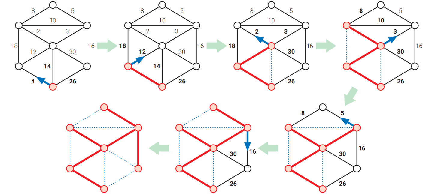 Jarník のアルゴリズムでは中間全域森 \(F\) の自明でない成分は一つしか存在せず、他の成分は全て孤立した頂点です。この自明でない成分 \(T\) は最初適当な頂点であり、次に示すステップを \(T\) が全域木になるまで反復します: