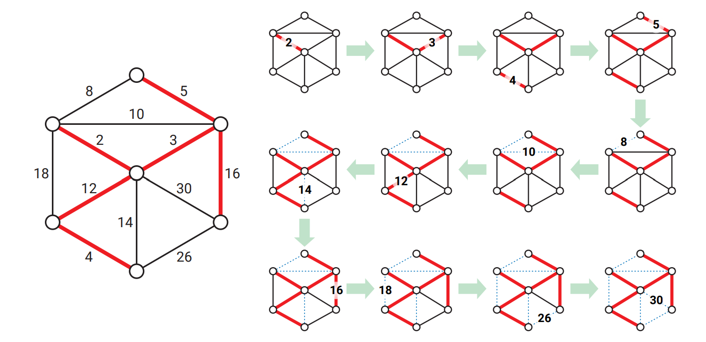 一般的な最小全域木アルゴリズムは \(G\) の頂点一つずつからなる森を \(F\) とした状態から始まり、各反復で頂点の間に辺を加えて木をつなげていきます。アルゴリズムが停止したとき \(F\) は一つの全域木となり、不変条件からそれが \(G\) の最小全域木となるという寸法です。もちろん最小全域木に含まれない辺も存在するので、森に加える辺は慎重に選ばなければなりません。