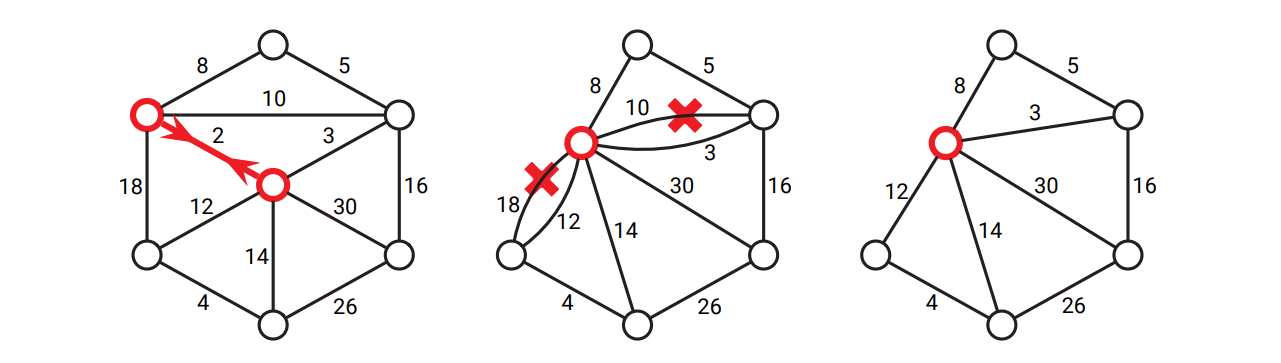 図 7.7辺を縮約して余分な並列辺を削除するこの章で説明した三つの古典的アルゴリズムは全て、縮約を使って次のように簡潔に表現できます。三つのアルゴリズムは最初に入力グラフ \(G\) のコピー \(G^{\prime}\) を作ってから処理を開始し、\(G^{\prime}\) の安全な辺を繰り返し縮約していきます。最小全域木は縮約された辺全体からなります。