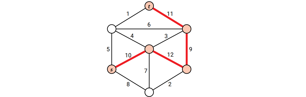 多くの古典的な最小全域木アルゴリズムはこの章で説明した "安全" な辺と "不要" な辺という表現を使っていますが、他の定式化もあります。\(G\) を辺に重みの付いた無向グラフとし、辺の重みは全て異なっているとします。ある辺が危険 (dangerous) とはその辺が \(G\) のある閉路で最大の重みを持つことを言い、ある辺が有用 (useful) とはその辺が \(G\) のどの閉路にも含まれていないことを言います。