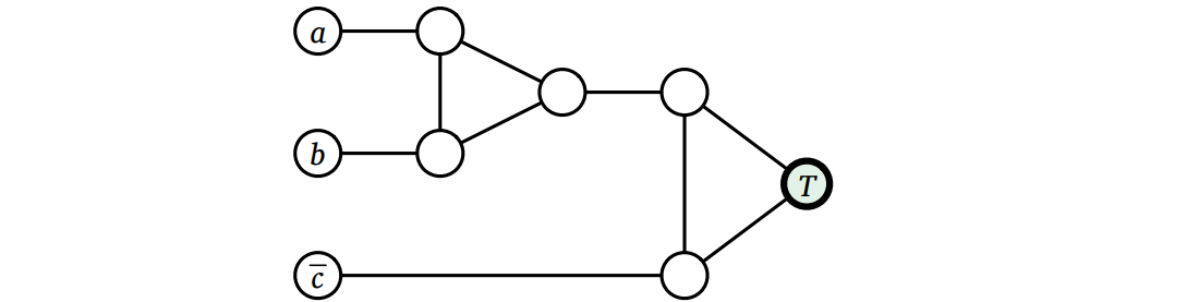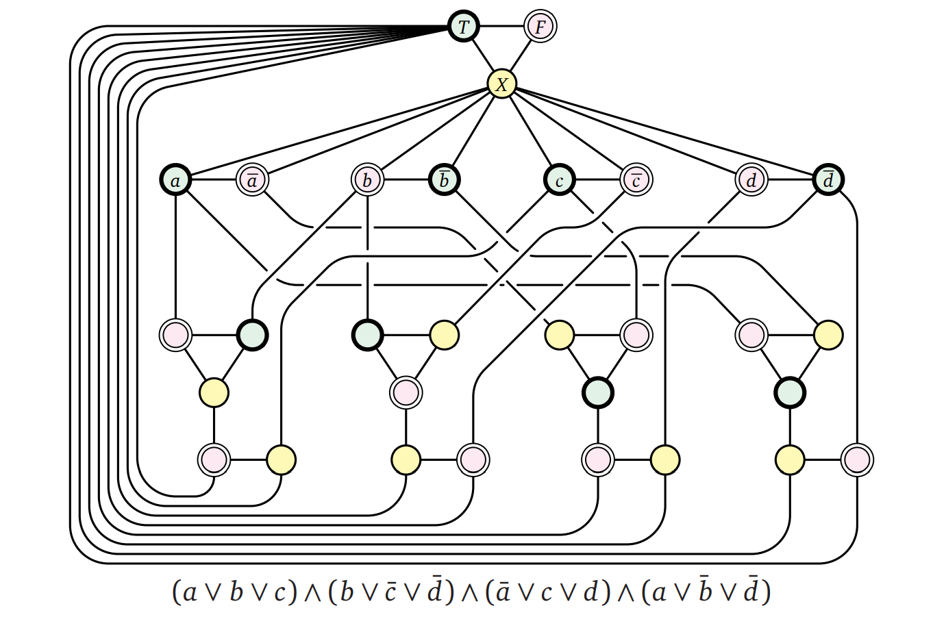 こうして出来上がるグラフの正しさの証明はこれまでにほぼ終わっています。式が充足可能ならば、任意の真偽値割り当てに基づいてリテラルの頂点を彩色でき、さらに (どの節にも \(\textsc{True}\) と \(\textsc{False}\) が少なくとも一つ含まれることから) その彩色を全ての節ガジェットに対する彩色に拡張できます。逆にグラフが 3-彩色可能ならば彩色から変数に対する真偽値割り当てを作ることができ、その割り当ては各節の少なくとも一つのリテラルを \(\textsc{True}\) にするので、全体の式を充足させます。