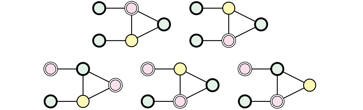 図 12.11「半分の」ガジェットに対する全ての真 3-彩色 (色の置換を同一視している)
