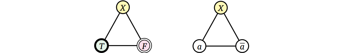 変数ガジェット: \(\Phi\) の任意の変数 \(a\) に対して、\(a\) とラベルの付いた頂点、\(\overline{a}\) とラベルの付いた頂点、真偽値ガジェットの頂点 \(X\) からなる三角形がある。\(a\) は \(\textsc{True}\) または \(\textsc{False}\) に塗られ、それに対して \(\overline{a}\) は \(\textsc{False}\) または \(\textsc{True}\) に塗られる。