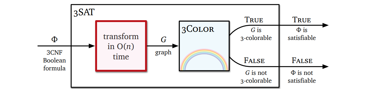 したがって \(\textsc{3Color}\) は NP 困難です。\(\textsc{3Color}\) は一般的な彩色問題 (「彩色に必要な色は最低何色?」) の特殊ケースなので、この一般的な最適化問題も NP 困難です。