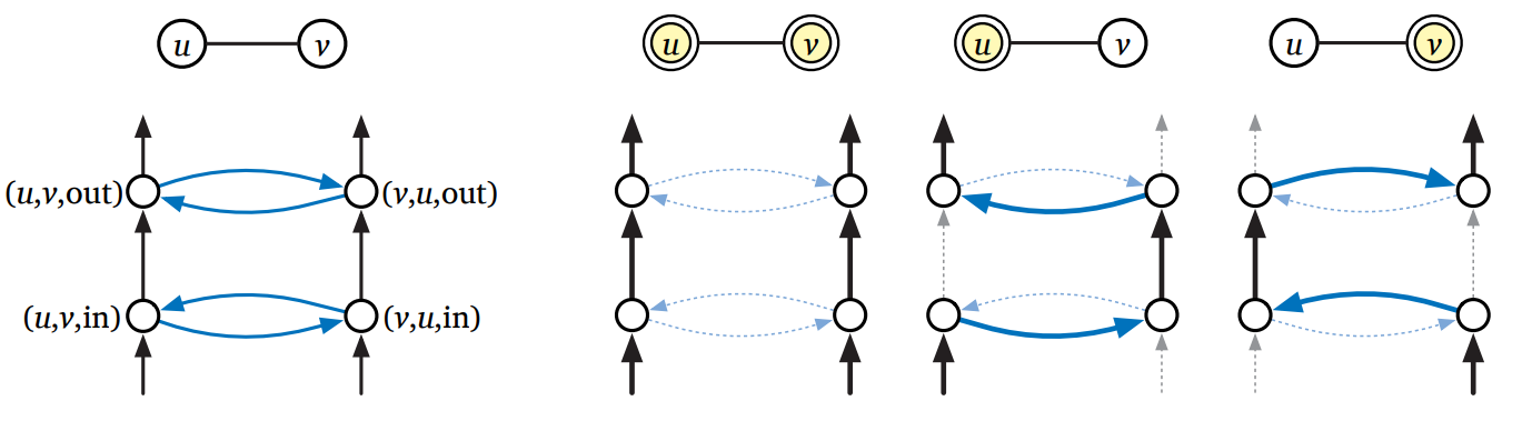 \(G\) の全ての無向辺 \(uv\) に対して、\(H\) は辺ガジェットとして頂点 \((u,v,\text{in})\), \((u,v,\text{out}) \), \((v,u,\text{in})\), \((v,u,\text{out}) \) およびその間の辺 \[ \begin{aligned} (u, v,\text{in}) & \rightarrow (u, v, \text{out})& (u, v,\text{in}) & \rightarrow (v, u,\text{in}) \\ (v, u,\text{in}) & \rightarrow (u, v,\text{in})& (v, u,\text{in}) & \rightarrow (v, u, \text{out}) \\ (u, v, \text{out}) & \rightarrow (v, u, \text{out})& (v, u, \text{out}) & \rightarrow (u, v, \text{out}) \end{aligned} \] を持つ。下図にあるように、これらの辺以外に "in" 頂点には入ってくる辺が、"out" 頂点には出ていく辺がある。ここで \(H\) の任意のハミルトン閉路について、辺ガジェットの通り抜け方は三種類しかない。つまり、両方の道を別々に通るか、右の道から入って全ての頂点をたどるか、左の道から入って全ての頂点をたどるかである。