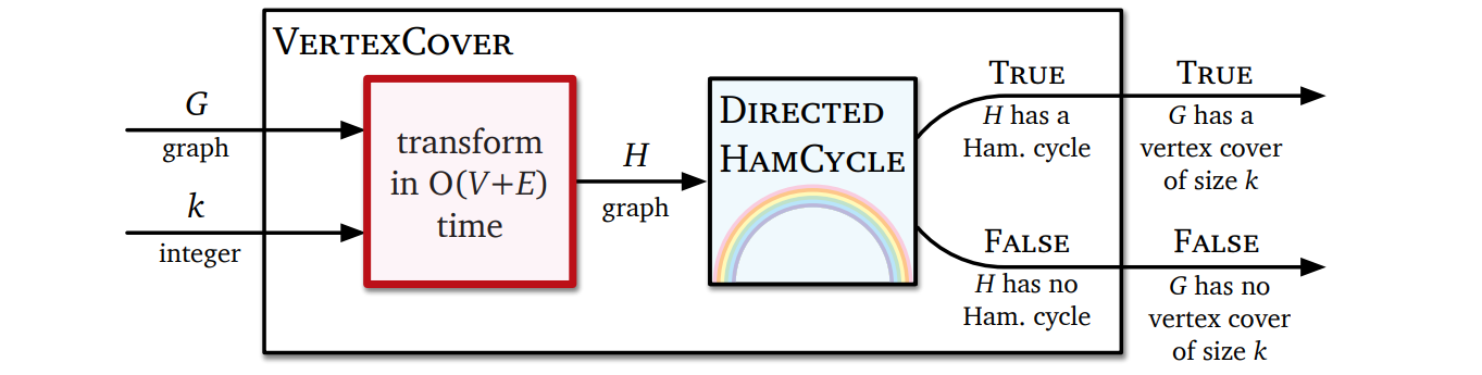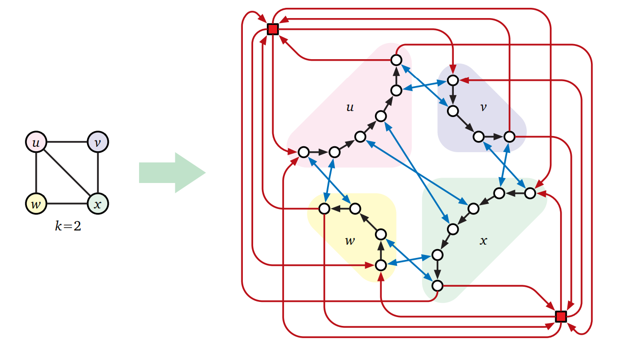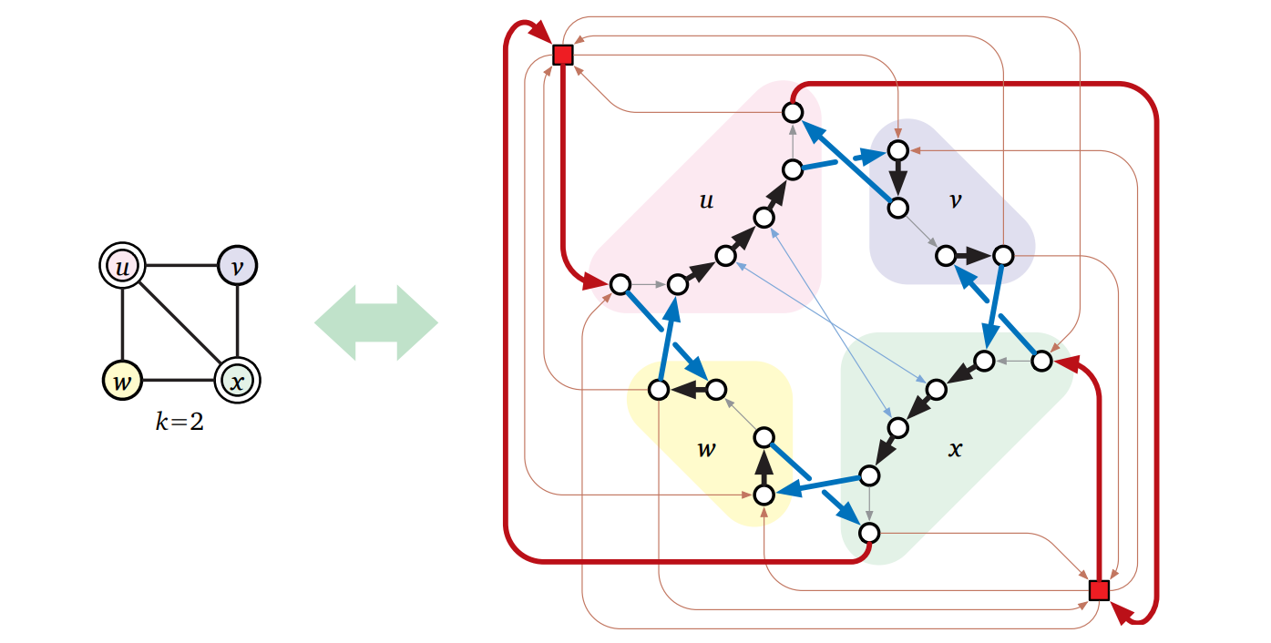 以上より、「\(G\) に大きさ \(k\) の頂点被覆がある \(\iff\) \(H\) にハミルトン閉路がある」が言えます。\(G\) から \(H\) への変換には最大でも \(O(n^{2})\) 時間しかかからないので、有向グラフに対するハミルトン閉路問題が NP 困難であることが分かります。