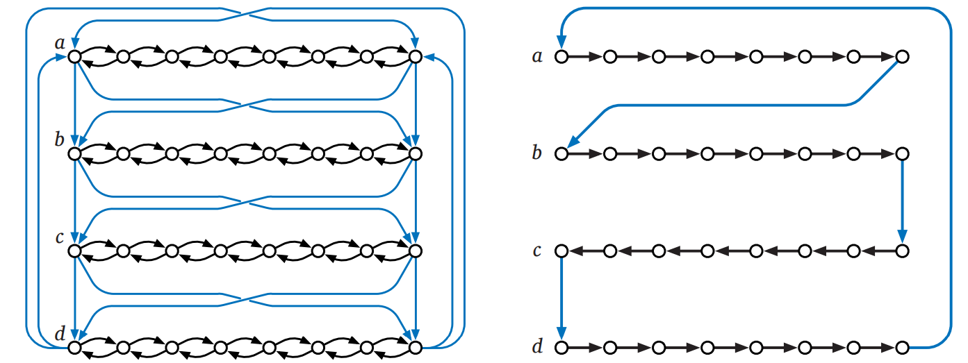 \((\Leftarrow)\) \(H\) にハミルトン閉路 \(C\) が含まれるとする。\(C\) には被覆頂点から頂点鎖の最初の頂点への辺が少なくとも一つ含まれる。ハミルトン閉路が辺ガジェットをどう通り抜けるかについての考察から、\(C\) が頂点鎖に入ったときにはその頂点鎖から出てくることが帰納的に分かる。よって \((u,v,\text{in})\) という形の任意の頂点について、\(C\) には \((u,v,\text{in}) \rightarrow (u, v, \text{out})\) という単一の辺または \((u, v, \text{in}) \rightarrow\) \((v, u, \text{in}) \rightarrow\) \((v, u, \text{out}) \rightarrow\) \((u, v, \text{out})\) という迂回路が含まれる。この辺または迂回路の後にあるのは \(u\) が頂点鎖の最後の頂点である場合には被覆頂点であり、そうでない場合は \(u\) の頂点鎖における次の辺ガジェットである。