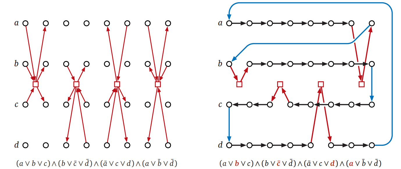 こうして出来上がるグラフ \(G\) にはちょうど \(2^{n}\) 個のハミルトン路が含まれ、それぞれが \(\Phi\) の \(n\) 個の変数に対する異なる真偽値割り当てに対応します。具体的には、\(i\) 番目のガジェットを左から右にたどるなら \(x_{i} = \textsc{True}\) であり、右から左なら \(x_{i} = \textsc{False}\) です。次の図も参照してください: