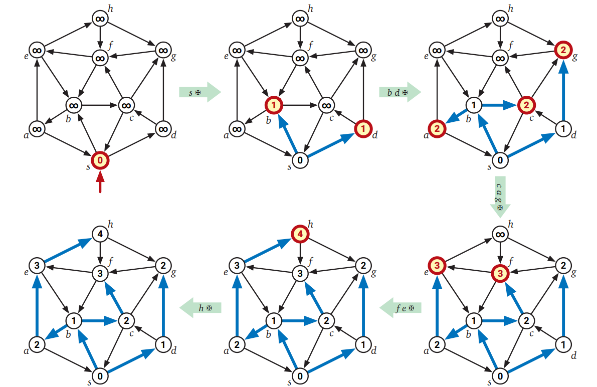 また、"\(\text{if } \mathit{dist} (v) > \mathit{dist}(u) + 1\)" という条件を (明らかに) より単純な "\(\text{if } \mathit{dist}(v) = \infty\)" で置き換えることができることも分かります。他のグラフ走査アルゴリズムにおいて全ての頂点に一度だけ訪れることを保証する "印" の役割を、このアルゴリズムでは距離が果たすことになります。つまり頂点にラベル付けされた距離が有限ならばその頂点には "印が付いて" います。