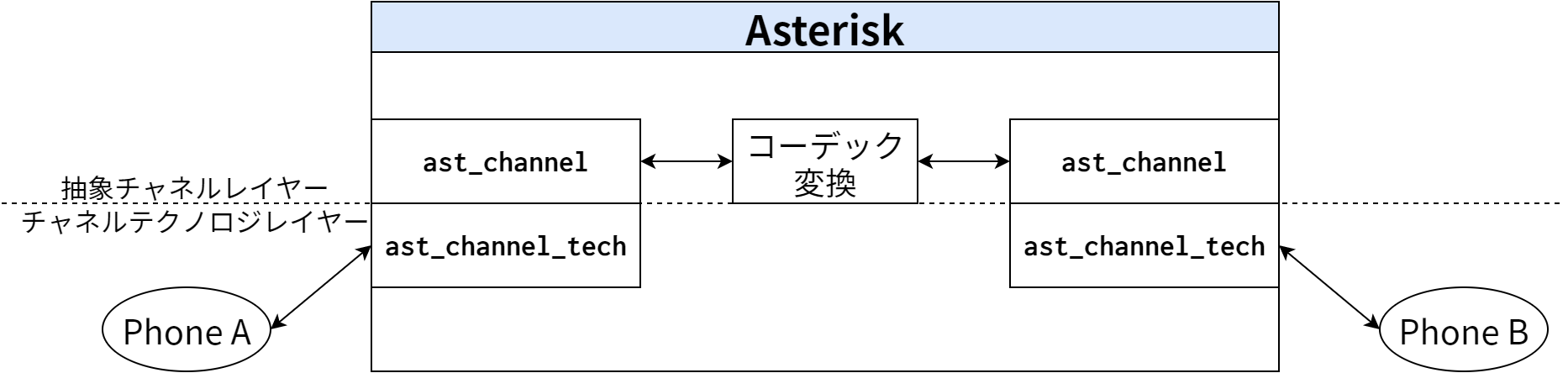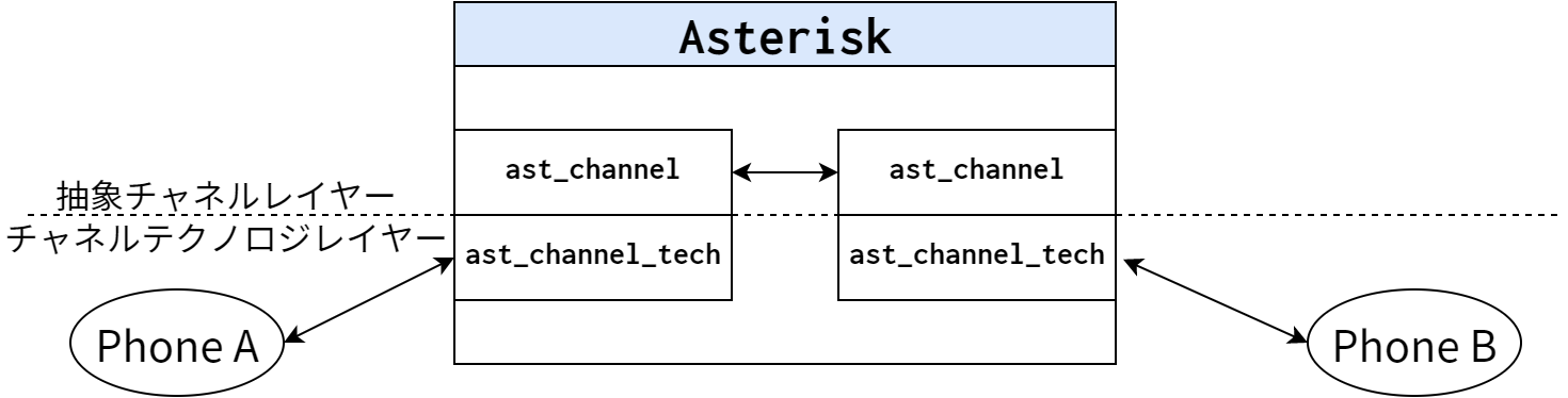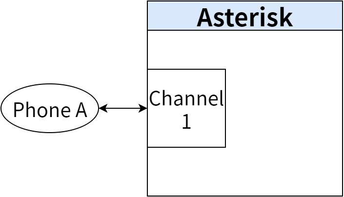 Asterisk におけるチャネル (channel) とは、Asterisk システムと通話エンドポイントとの接続のことです (図 1.1)。この接続の最も典型的な例は、ある電話が Asterisk システムを使った通話を行う場合です。この場合、Asterisk コードにおける ast_channel データ構造のインスタンスが作成されます。例えば通話者がボイスメールを使うときなどにこのような通話が作成されます。