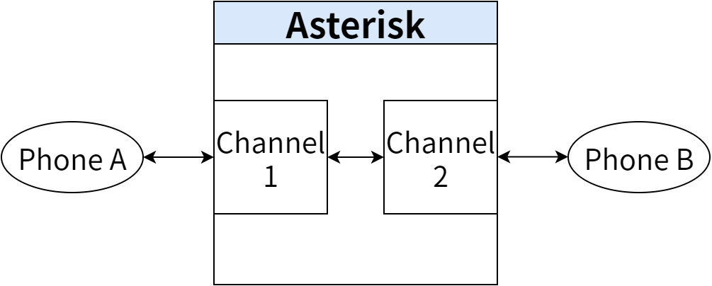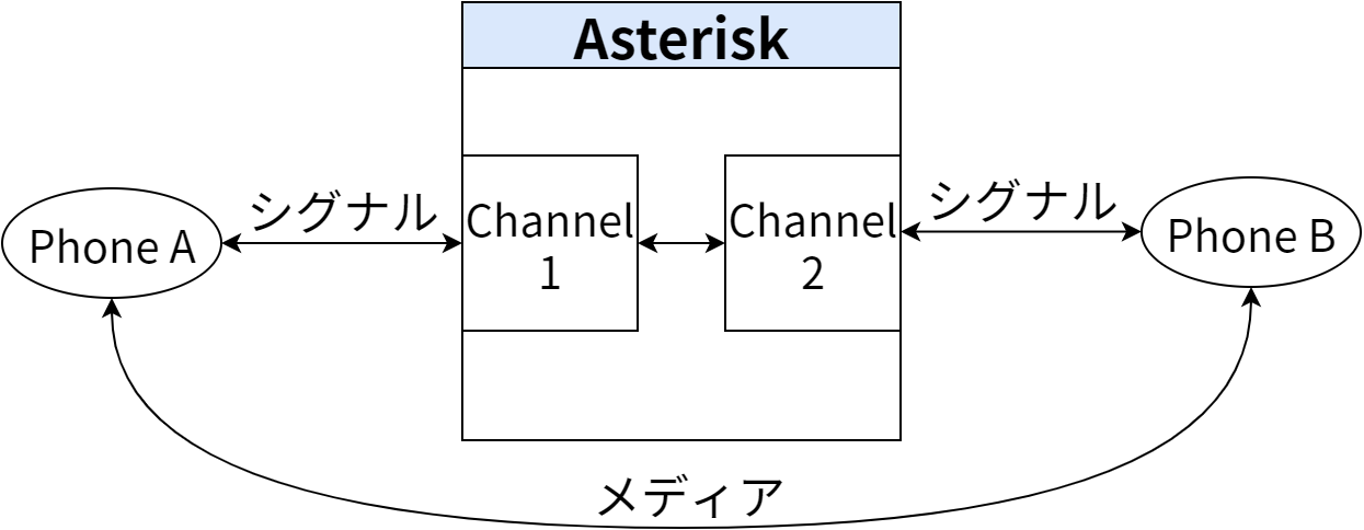 このように接続されている Asterisk チャネルのことをチャネルブリッジ (channel bridge) と言います。またチャネルをブリッジするとは、二つのチャネルを繋いでその間でメディアをやり取りできるようにすることを言います。チャネルを通してやり取りされるメディアは通常オーディオのストリームですが、ボイスやテキストのストリームもやり取りできます。複数のメディア (オーディオとビデオなど) を同時にやり取りする場合でも、そのやり取りは単一の Asterisk のチャネルによって処理されます。図 1.2 では phone A と phone B に対するチャネルが一つずつあり、その間のブリッジが A から B へ向かうメディアおよび B から A に向かうメディアの管理を受け持ちます。二つのデバイスの間のメディアストリームは全て Asterisk を通して行われ、Asterisk が理解できない、あるいは Asterisk に完全な制御を許さない通信方式は使うことができません。こうすることで Asterisk は、オーディオを録音したり、改変したり、異なるテクノロジの間で変換したりできるようになっています。