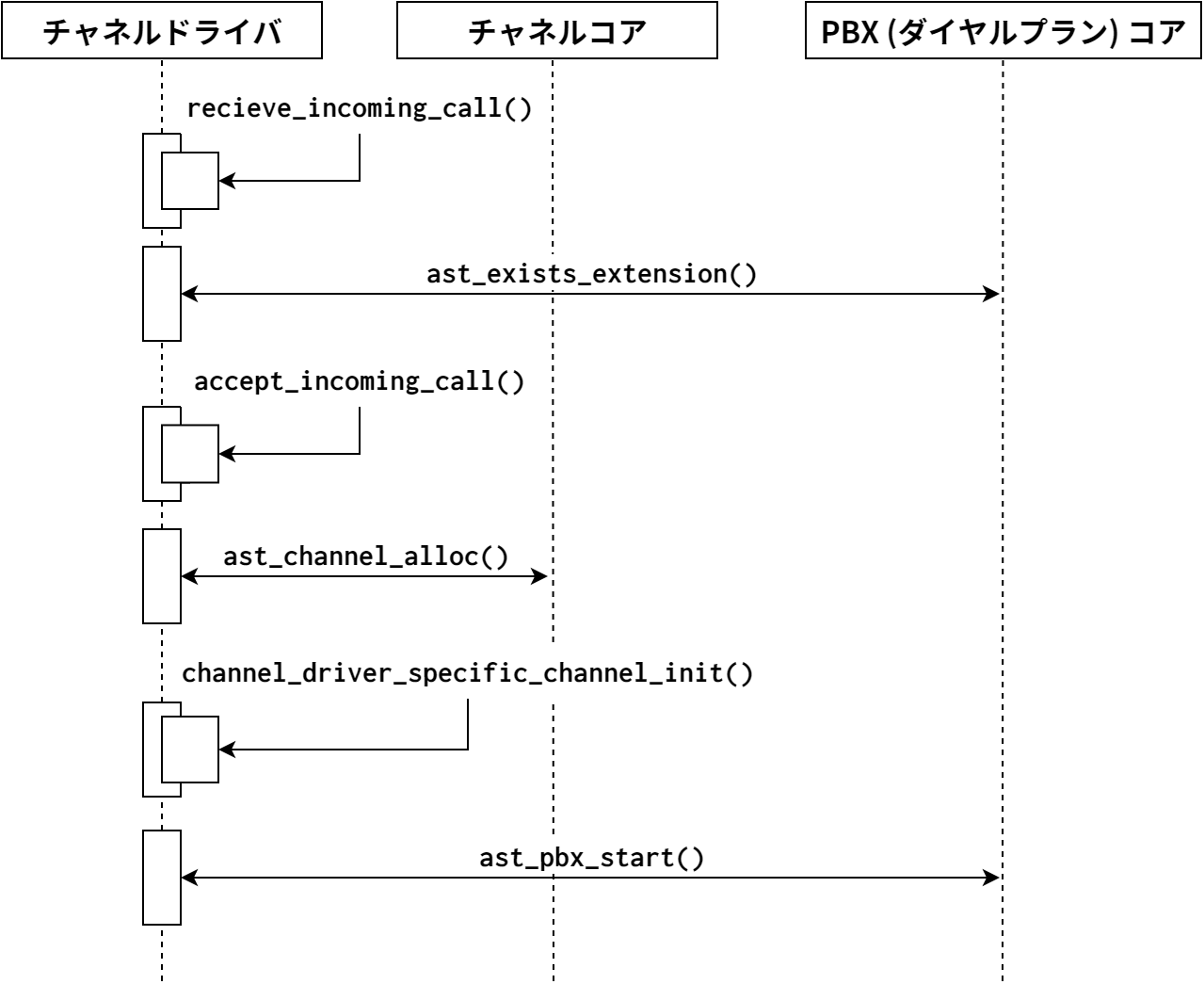 Asterisk のチャネルドライバインターフェースは ast_channel_tech 構造体で定義され、この構造体はチャネルドライバが実装すべきメソッドをいくつか定義しています。そのようなメソッドの中で一つ目にあるのが requester であり、これは ast_channel のファクトリメソッドです。通話の発信または受信によって Asterisk のチャネルが作られるとき、 ast_channel_tech に含まれるその通話に応じた種類の requester の実装が ast_channel のインスタンス化と初期化を行います。