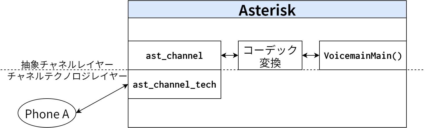 前にコーデック変換モジュールについて説明しましたが、この通話シナリオではこのモジュールの実装がとても重要になります。ボイスメールのコードが再生するオーディオファイルのフォーマットは通話者と Asterisk システムの間の通信で使われるフォーマットと同じであるとは限らないので、そのような場合にはコーデックの変換するパスが作成されます。