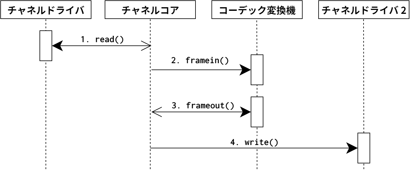 write: デバイスへast_frameを送る。チャネルドライバは受け取ったデータを実装されている通話プロトコルを使ってパケット化し、エンドポイントへ送る。 -