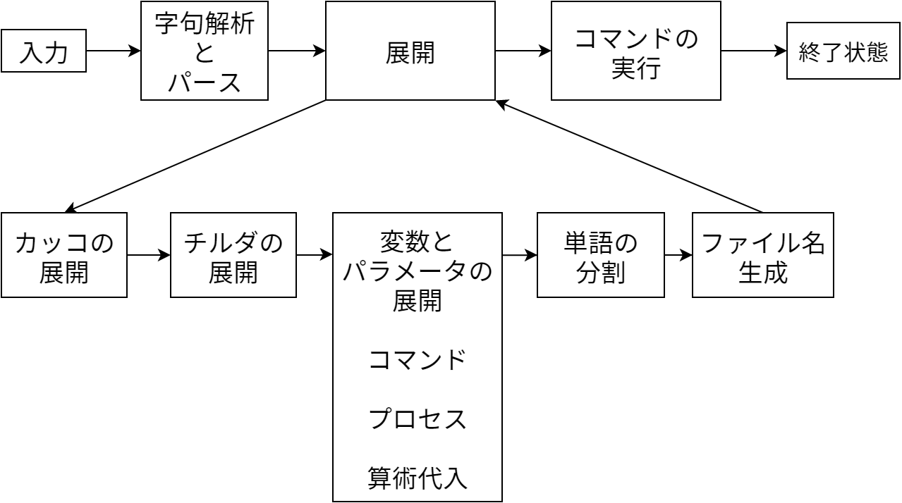 シェルの基本的なアーキテクチャを一つのパイプラインとみなすなら、単語の展開はその中にある独立したもう一つのパイプラインとみなすことができるでしょう。単語の展開の各ステージは単語を受け取り、変換を何回か行ってから、次のステージに渡します。全ての展開が完了すると、コマンドが実行されます。