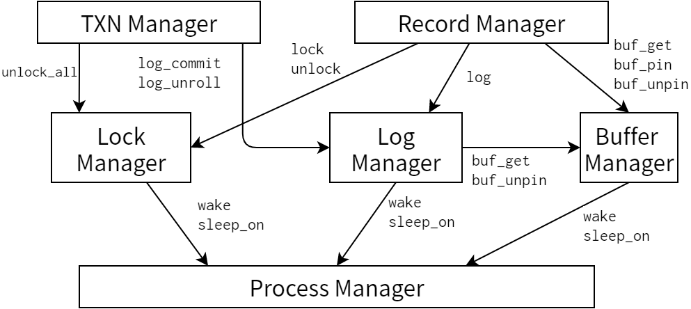 LIBTP の実装と Berkeley DB 2.0 の設計の間で唯一大きく異なるのは、Berkeley DB 2.0 にはプロセスマネージャが無い点です。LIBTP ではスレッドを同期するときにスレッドの方からライブラリに問い合わせるという方法を取っており、サブシステムレベルの同期機構が存在しませんでした。Section 4.4 でも議論しますが、オリジナルの設計の方が上手く行っていた可能性もあります。