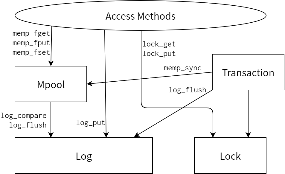 まず、四つのサブシステムは固有の API を持ち、最初のバージョンでは各サブシステムがメソッドと結びついたオブジェクトハンドルを持ちました。例えば、Berkeley DB のロックマネージャを使ってデータベースと関係ないロックを処理でき、Berkeley DB のバッファマネージャを使ってデータベースと関係のない共有メモリ上のページを処理できます。開発が進むにしたがって、システムに固有のハンドルは Berkeley DB を簡略化するために API から取り除かれました。四つのサブシステムは個別のコンポーネントでありそれぞれ独立に使用できますが、現在では DB_ENV という“環境”ハンドルが共有されています。このようにアーキテクチャを洗練させることで、レイヤー化と一般化が進みました。ときにはレイヤーが変更されることもあり、現在でもサブシステムが他のサブシステムに踏み入っている部分がいくつかありますが、ソフトウェアの一部を独立したシステムとして考えることはプログラマーが従うべき良いルールでしょう。