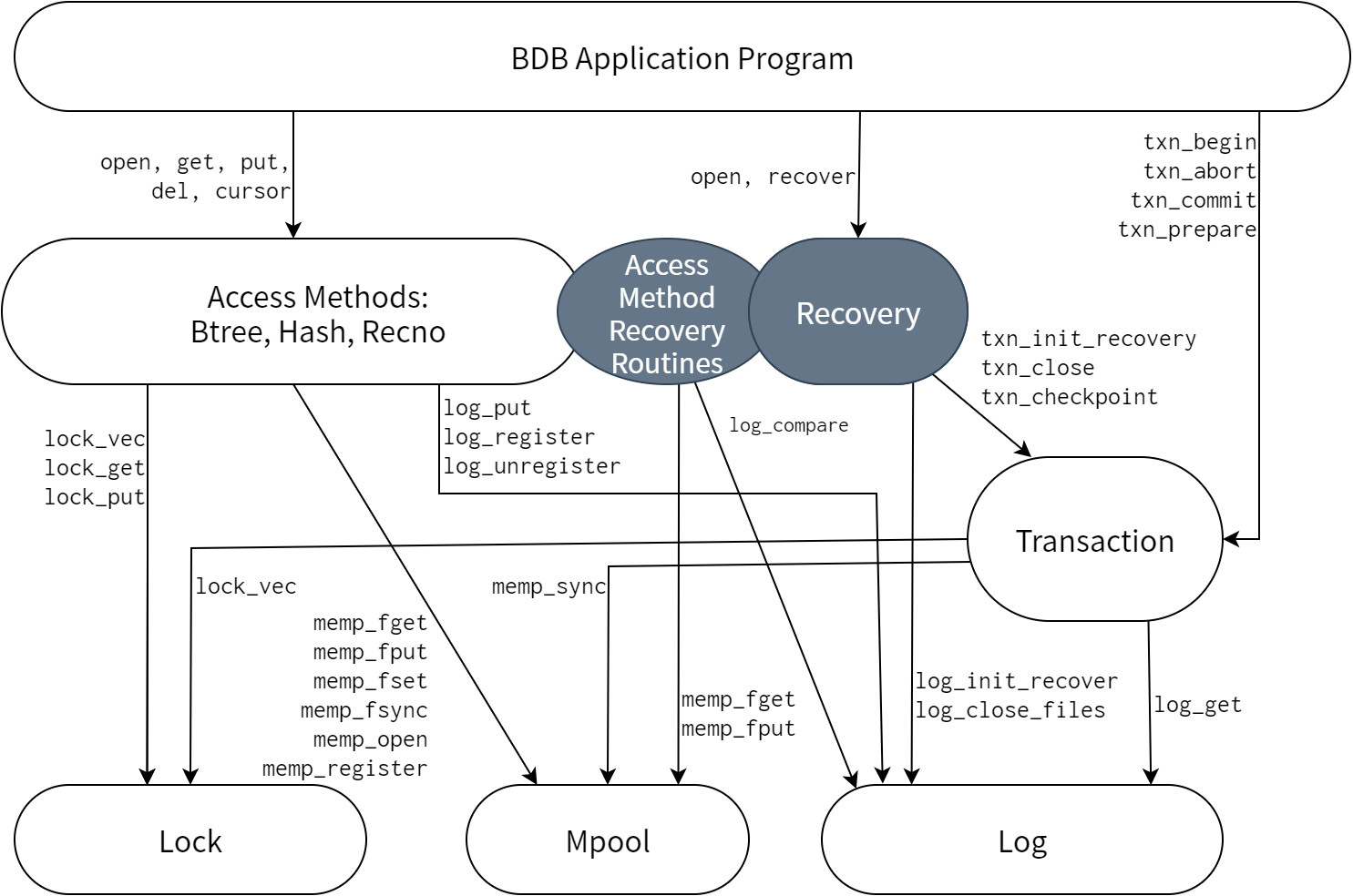実際にリリースされた Berkeley DB 2.0.6 のアーキテクチャ (図 4.3) をオリジナルの設計と比べると、図中グレーで示される堅牢なリカバリマネージャを追加で実装していることが分かります。このシステムにはアクセスメソッドによって実行される undo や redo といったリカバリ命令やドライバインフラが含まれます。リカバリ命令は図中の“Access Method Recovery Routines”とラベルの付いた楕円で、ドライバインフラは“Recovery”とラベルの付いた丸い長方形で示されています。LIBTPではログとリカバリのルーチンがアクセスメソッドごとに存在していましたが、Berkeley 2.0 では一貫した設計となっています。この設計によってモジュール間のインターフェースがより洗練されたものになっています。