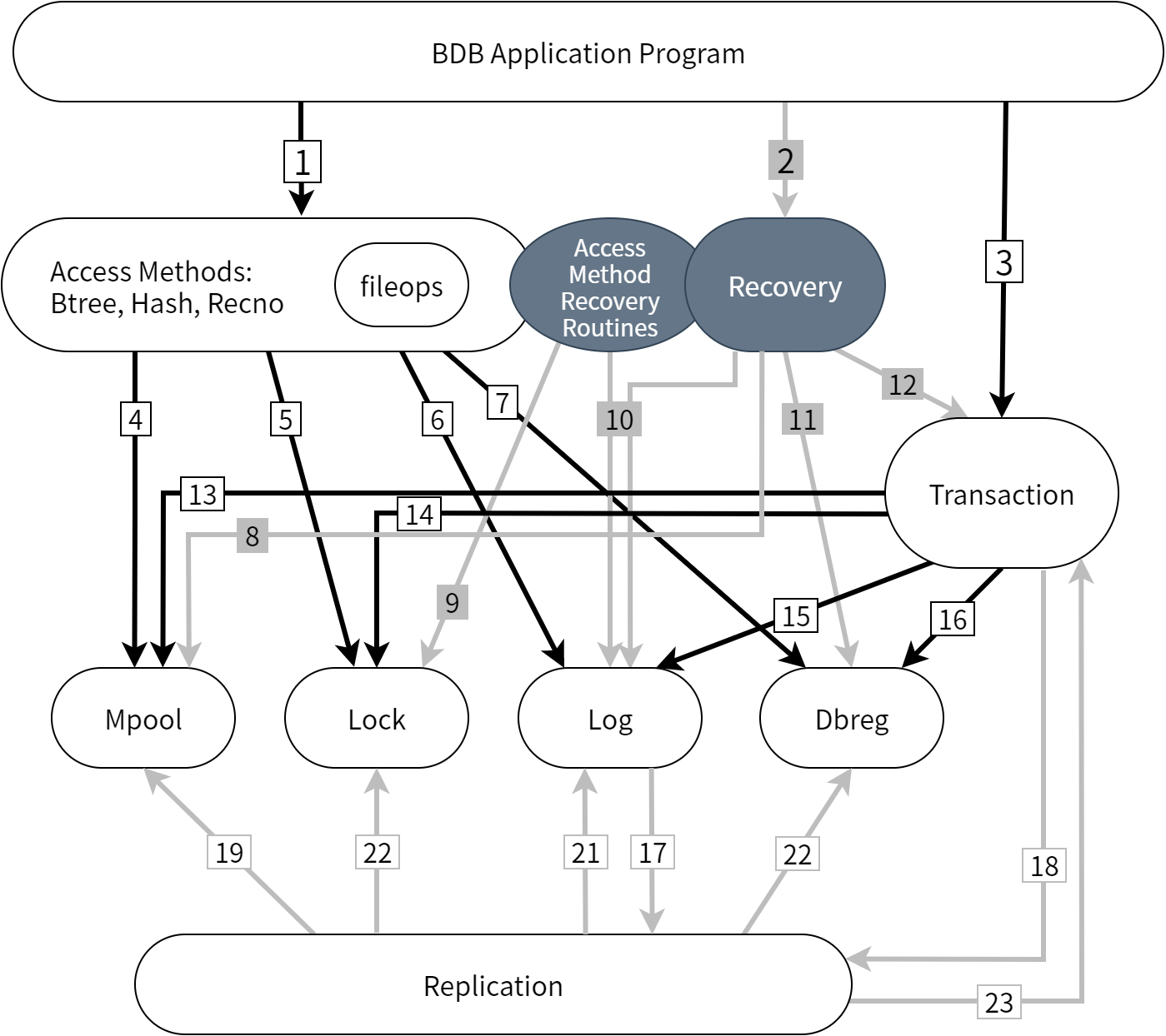 図 4.4 に Berkeley DB-5.0.21 のアーキテクチャを示します。図中の番号は 表 4.1 にある API に対応します。現在のアーキテクチャにはオリジナルのアーキテクチャの面影を見ることができますが、長い開発期間を通じてモジュールが追加され、モジュールが分解され (log は log と dbreg になりました)、モジュール間の API の数が増えています。