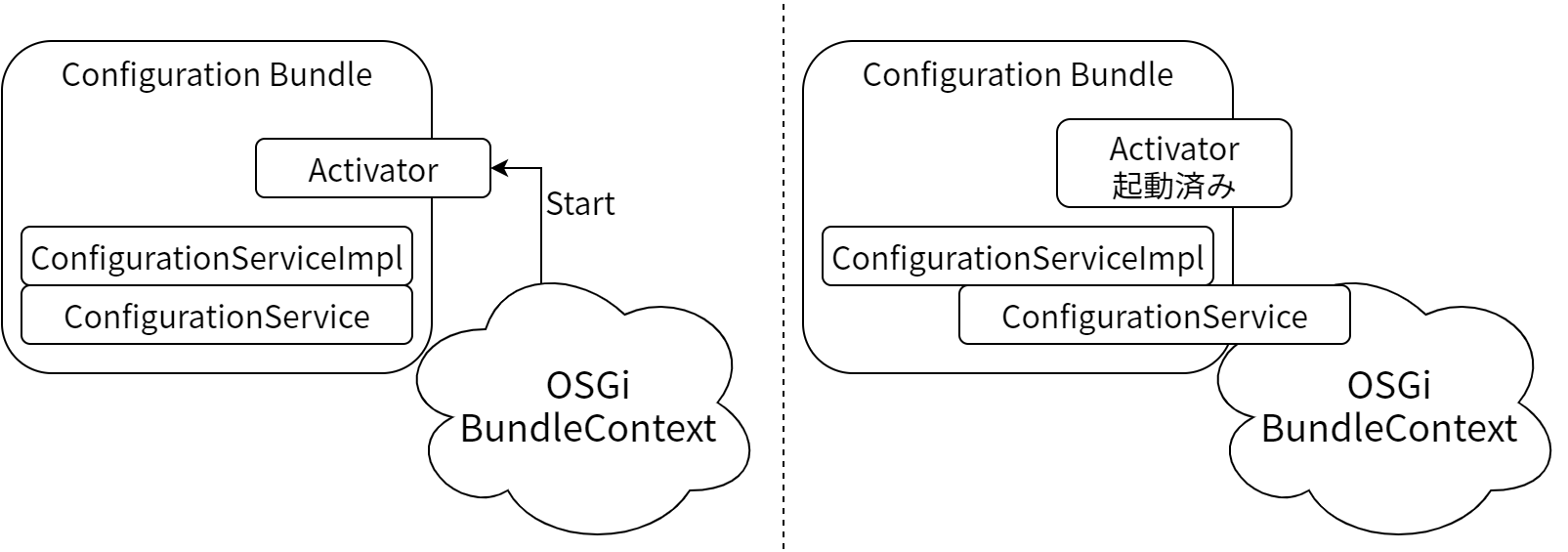 最後にバンドルを BundleContext に登録して ConfigurationService の実装を伝えれば、バンドルを使えるようになります。次のようにします: