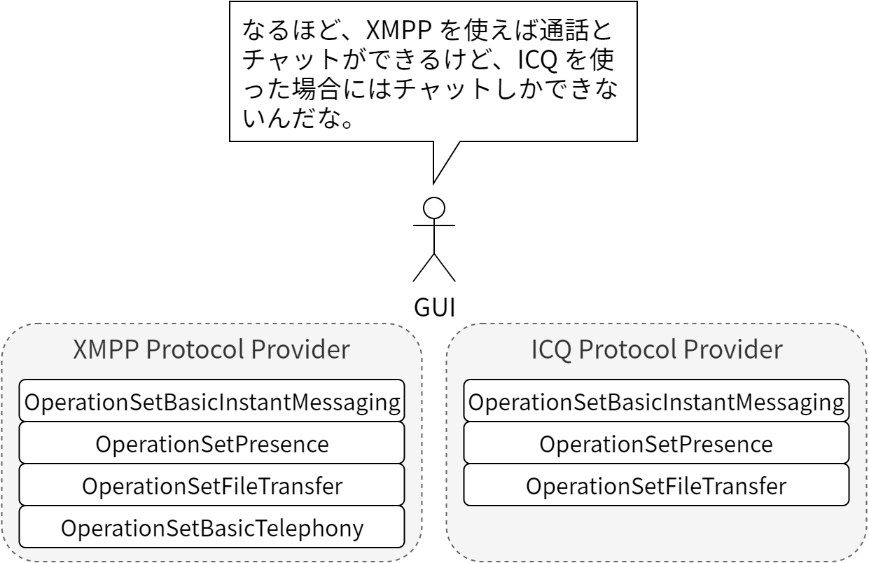 前述の通り、 ProtocolProviderService は様々な通信プロトコルを実装し、それらの間の違いを吸収する必要があります。これはメッセージの送信といった全てのプロトコルに共通の機能に対しては簡単なことですが、一部のプロトコルしかサポートしない機能に対しては自体が複雑になります。この差異がサービスそのものに由来することもあります。例えばサーバーに連絡先リストを保存する機能は多くのプロトコルでサポートされていますが、SIP サービスのほとんどはこれをサポートしません。また MSN と AIM も良い例です。オフラインのユーザーにメッセージを送る機能を持たないのがこの二つだけだったことがありました (現在では違います)。