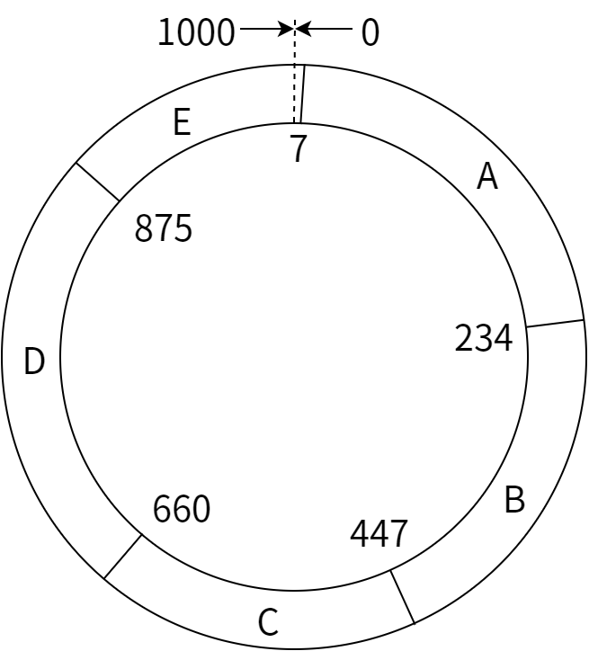 この例では L = 1000 および H(A) mod L = 7, H(B) mod L = 234, H(C) mod L = 447, H(D) mod L = 660, H(E) mod L = 875 であり、ここから各キーがどのサーバーに属するかが分かります。つまり、キーはリングの中でそのハッシュ値が収まるようなサーバーに属します。例えば A が担当するのはハッシュ値が [7, 233] であるキーであり、E の担当はハッシュ値が [875, 6] であるようなキーです (1000 の次は 0 です)。そのためもし H('employee30') mod L = 899 ならば employee30 は E に保存され、H('employee31') mod L = 234 ならば employee31 は B に保存されます。