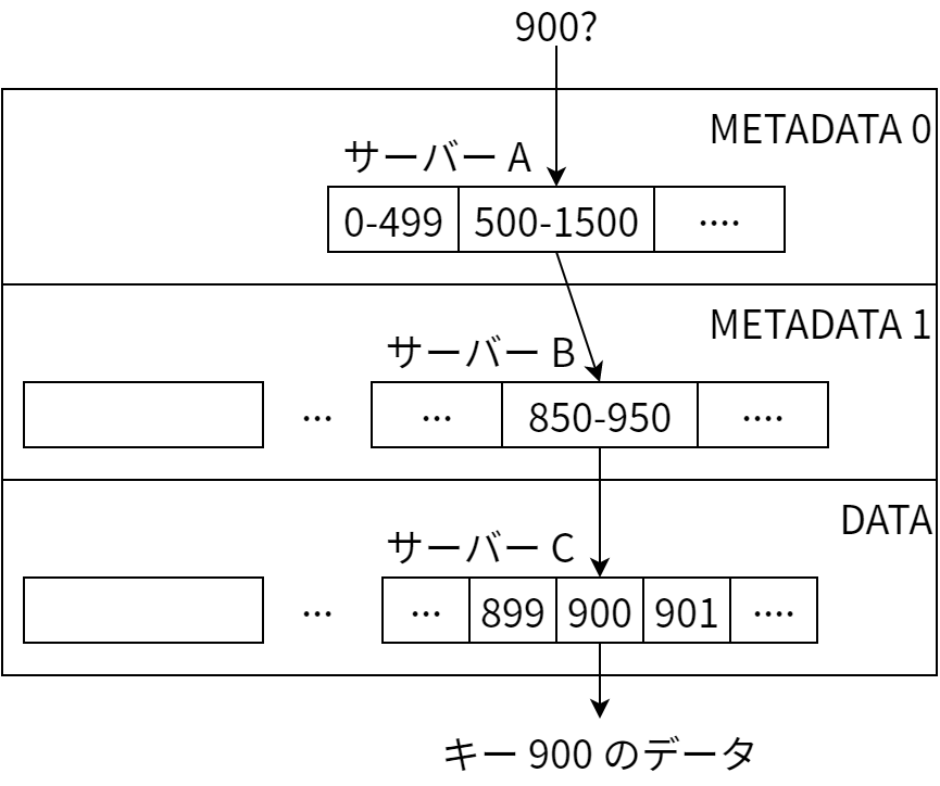 この例では最初にクライアントがキー 900 のデータをサーバー A に問い合わせます。サーバー A にはレベル 0 のメタデータを持つタブレットがあるので、A はこのタブレットからレベル 1 のメタデータを検索してクライアントに返します。クライアントにはサーバー B に 500 から 1500 までのキーに関するメタデータを含んだタブレットがあると伝わるので、クライアントはこのサーバー B にキーの問い合わせを行います。サーバー B からは 850 から 950 までのキーのデータを保存しているのはサーバー C にあるタブレットであるとクライアントに伝わるので、クライアントはサーバー C に最後の問い合わせを行い、行データを入手します。レベル 0 とレベル 1 のメタデータはクライアントでキャッシュされ、同じリクエストによってタブレットサーバーに高い負荷がかからないようになっています。BigTable の論文では、この三レベルの階層構造によって 128 MB のタブレットに 261 バイトのデータを格納できると説明されています。