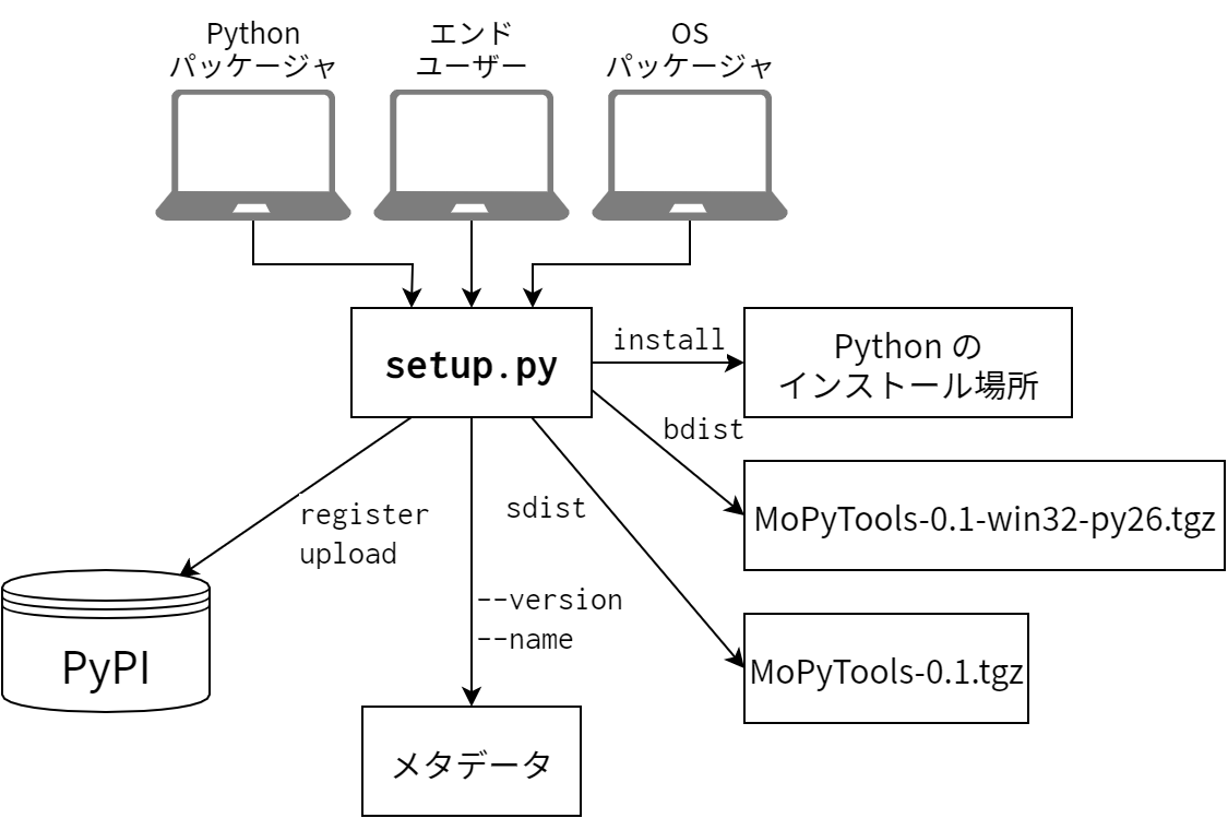 つまりプロジェクトをビルドするのであれ、公開するのであれ、インストールするのであれ、setup.py がプロジェクトととの対話口となります。開発者はプロジェクトの内容を関数に対するオプションに記述し、そのファイルをパッケージングに関する全てのタスクに使用します。このファイルはインストーラがターゲットのシステムにプロジェクトをインストールするときにも使われます。