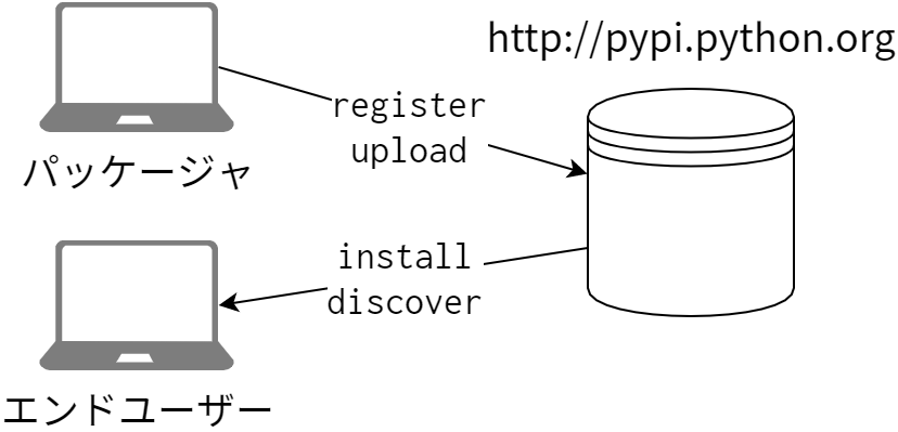 Python Package Index2 (PyPI) は CPAN のようなパッケージの中央レポジトリであり、プロジェクトの登録と公開は Distutils の register コマンドと upload コマンドを使って行います。register コマンドは Metadata ファイルをビルドし、それを PyPI に送信します。送信されたデータはウェブページやウェブサービスを通してインストーラなどのツールおよび人間が閲覧できるようになります。
