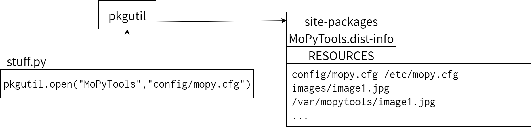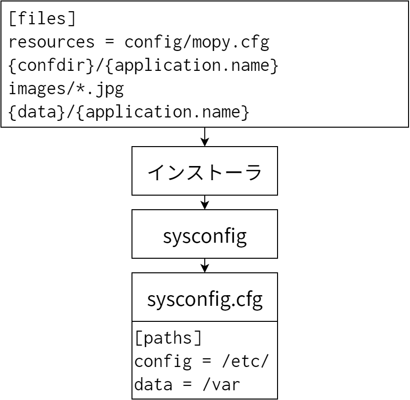 sysconfig モジュールは利用可能な変数のリストをドキュメントと共に提供し、各プラットフォームにおける変数のデフォルト値を設定します。例えば Linux における {confdir} の値は /etc です。そのためインストーラは上述のマッパーを sysconfig と共に使うことで、ファイルを配置場所をインストール時に計算できます。その後インストーラは RESOURCES ファイルを作成し、pkgutil によるファイル探索の準備が整います。