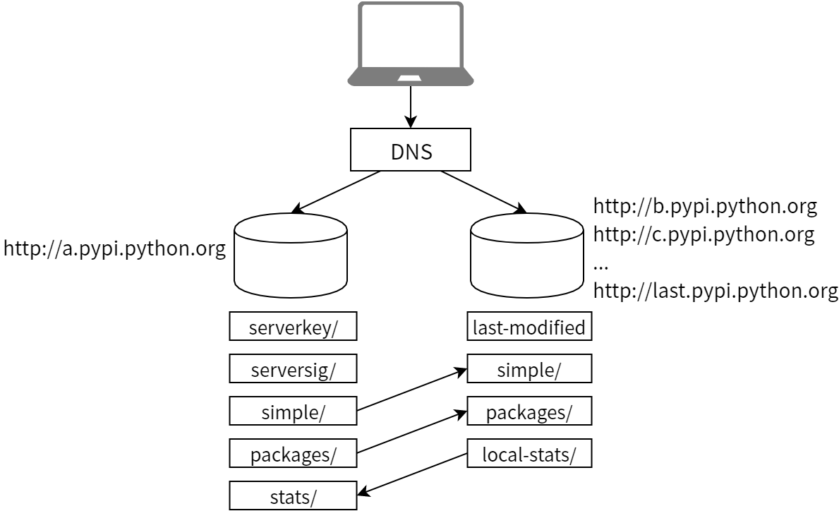 ミラーのリストは X.pypi.python.org という形のホスト名のリストとなっており、X は a, b, c, ..., aa, ab,... です。a.pypi.python.org がマスターサーバーで、ミラーは b から始まります。last.pypi.python.org のCNAME レコードは最後のミラーのホスト名を指しているので、PyPI を使うクライアントは CNAME を見るだけでミラーのリストを取得できます。