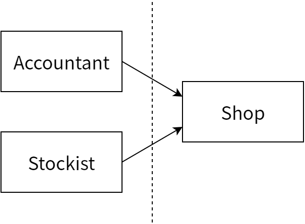 つまり Accountant と Stockist の両方がメソッドで Shop を引数として受け取るようにするということです。しかしここで気になるのが、Accountant が棚に商品を置くことはなく、Stockist が Shop の行う値上げを気にすることはない点です。そのため、図 16.2 に示すように線を引いた方が都合がよくなります: