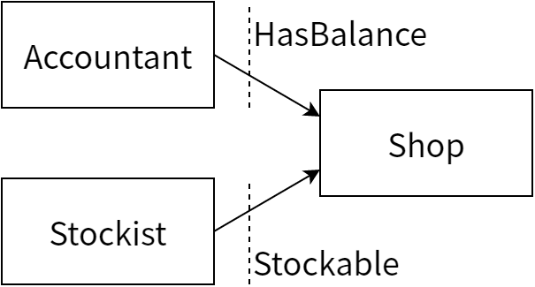 こうすると Shop は二つのインターフェースを実装することになりますが、そのインターフェースは明確に定義され、Shop が Accountant と Stockist を管理します。これがロールベースのインターフェースです: