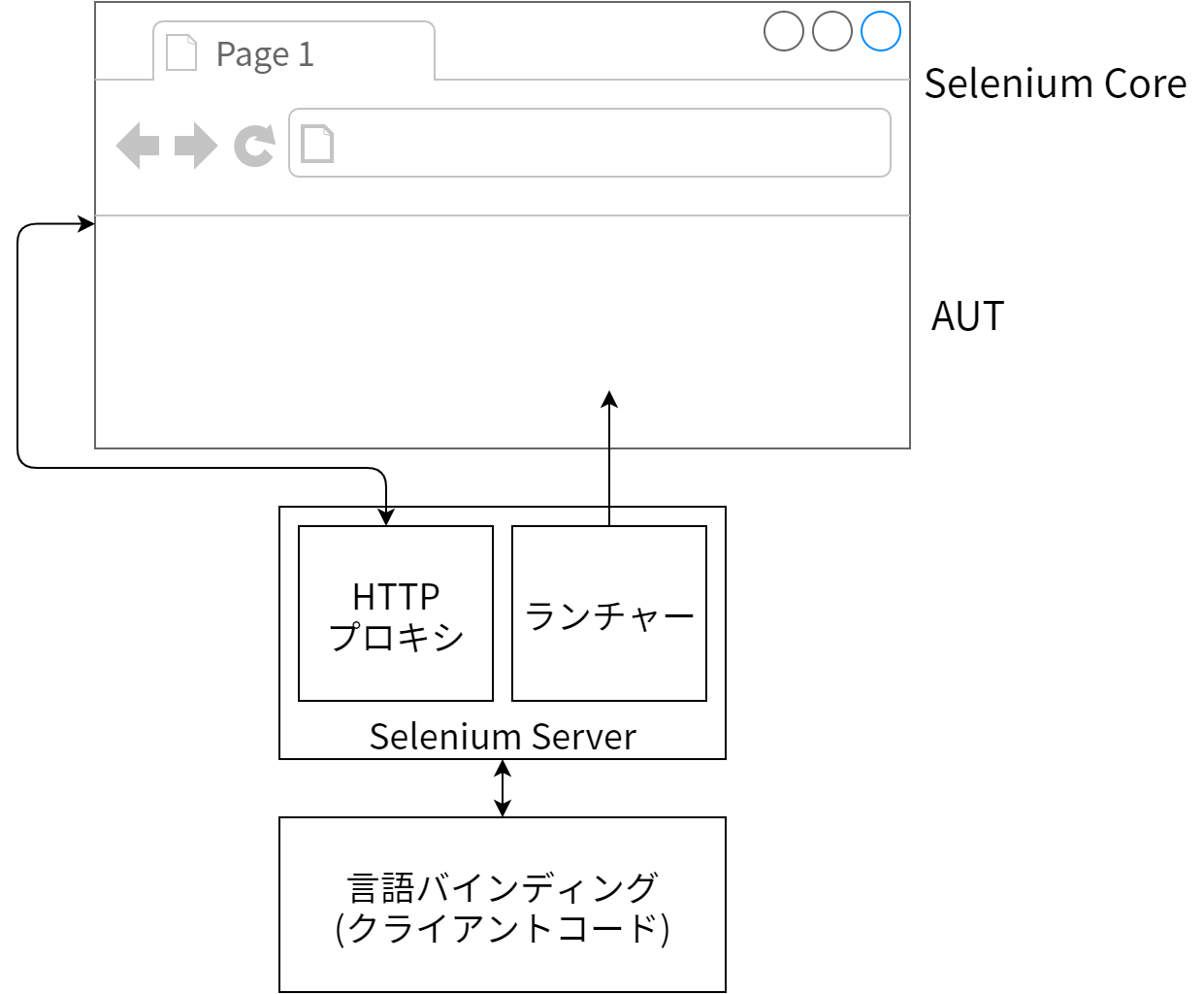 こういった問題を解決するために HTTP プロキシが開発され、全ての HTTP リクエストが Selenium を経由するようになりました。プロキシを使うことでブラウザの同一生成元ポリシー (現在のページが提供されたサーバー以外への通信を JavaScript に許さないというもの) による制限の多くを回避でき、最初に述べた問題が解決されます。またこの設計により他の言語で Selenium のバイディングを書くことが可能になります: 必要なのは HTTP リクエストを特定の URL に送信できることだけです。データのやり取りに使われるフォーマットは Selenium Core の表ベースのシンタックスを元にしており、このフォーマットは表ベースのシンタックスと共に“Selenese”として知られるようになりました。他言語へのバインディングを使えばブラウザを遠隔で制御できるので、このツールは“Selenium Remote Control”あるいは“Selenium RC”と呼ばれます。