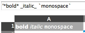 A1 に *bold* _italic_ `monospace` と入力すれば、図 19.15 のようにレンダリングされたリッチテキストが表示されます。