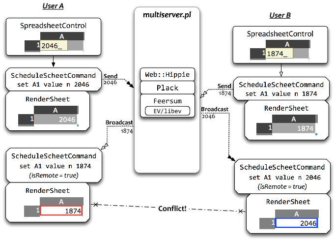 次に見る例は、共有スプレッドシートの複数人によるリアルタイム編集です。一見すると複雑に見えるこの問題も、SocialCalc のモジュラーな設計のおかげで、オンラインのユーザー全員に他のユーザーのコマンドをブロードキャストする処理を追加するだけで済みます。