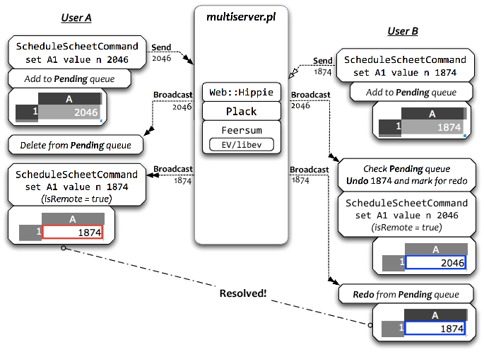 衝突は次のように解決されます。クライアントがコマンドをブロードキャストするとき、まずコマンドを Pending キューに追加します。そしてクライアントがリモートコマンドを受け取ったときには、そのコマンドが Pending キューにあるかどうかをチェックします。